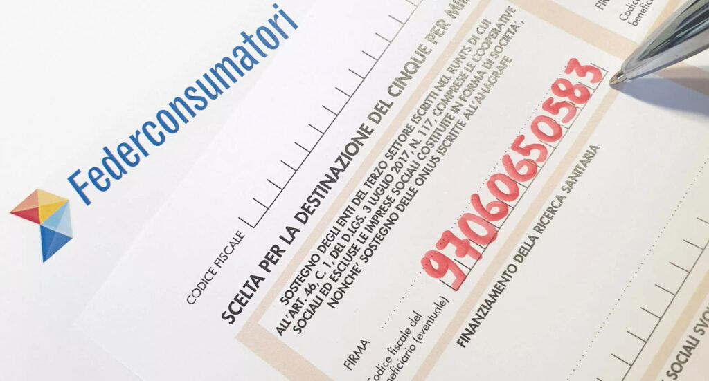 I contribuenti che non devono presentare la dichiarazione possono scegliere di destinare il cinque per mille dell’IRPEF utilizzando l’apposita scheda allegata allo schema di Certificazione Unica (CU) o al Modello REDDITI Persone Fisiche, inserendo il codice fiscale di Federconsumatori (97060650583) nel riquadro dedicato al sostegno del volontariato e delle altre organizzazioni non lucrative di utilità sociale, delle associazioni di promozione sociale e delle associazioni e fondazioni riconosciute che operano nei settori di cui all’art.10, c.1, lett. A), del D.Lgs. n. 460 del 1997.